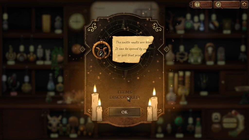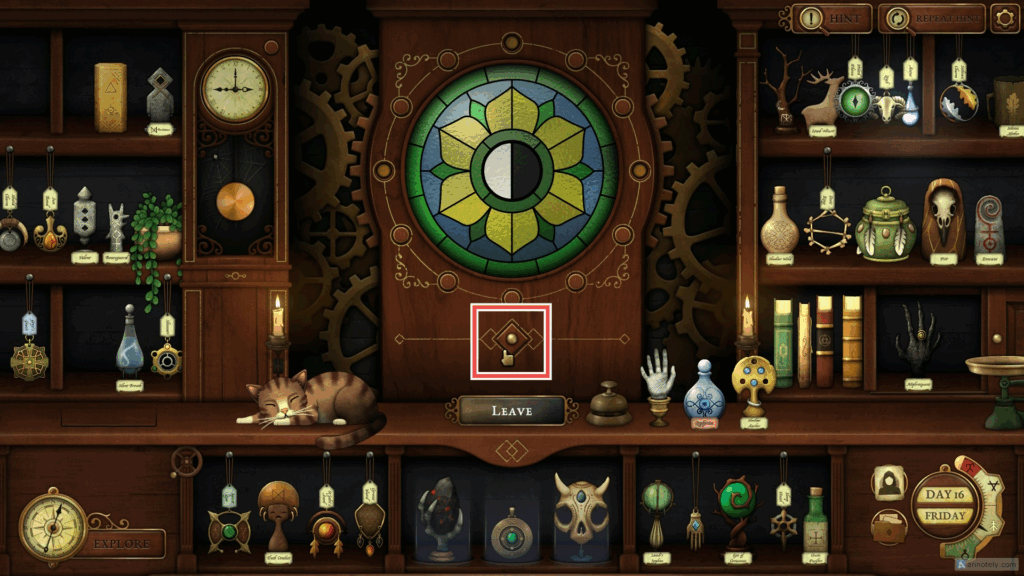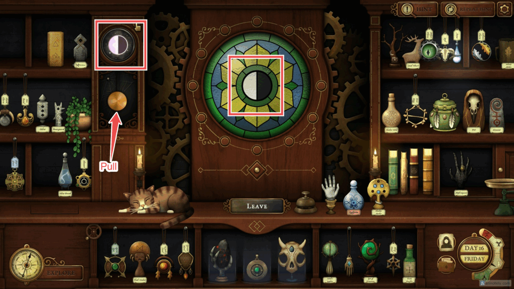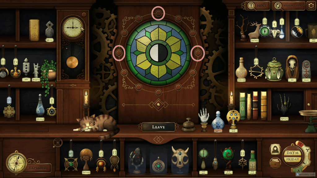 Cassander reveals a new Clock Puzzle in Strange Antiquities. From here on, you may have to rely on the pendulum clock and the secret vault to unlock special items. To open the secret vault, you must place three specific items on the plinths, guided by the clue notes left by visitors to your shop. These items will change from time to time, as mentioned on the clue notes left by visitors.