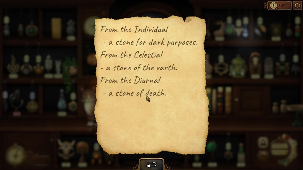 In Strange Antiquities, placing the correct items on the three plinths in the correct order unlocks a hidden cabinet containing a new clock puzzle: