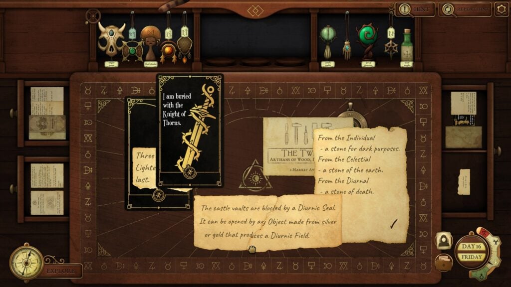 Lunima: Look through letters and notes to see if you can find any clues. The Knight of Thorns card, unlocked at the end of day 13, holds the clue to this item’s location. Open the catacombs map and the knight of thorns card.