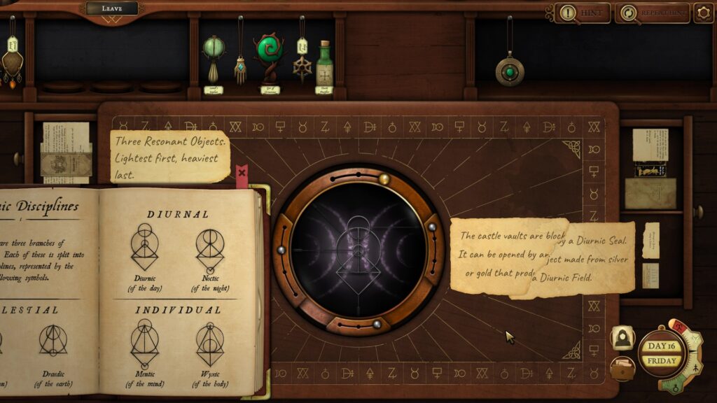 Open the Thaumic lens on the desk and replicate the Diurnic symbol by arranging the movable shapes. You will see the Diurnic field in the background ( See the screenshot below):