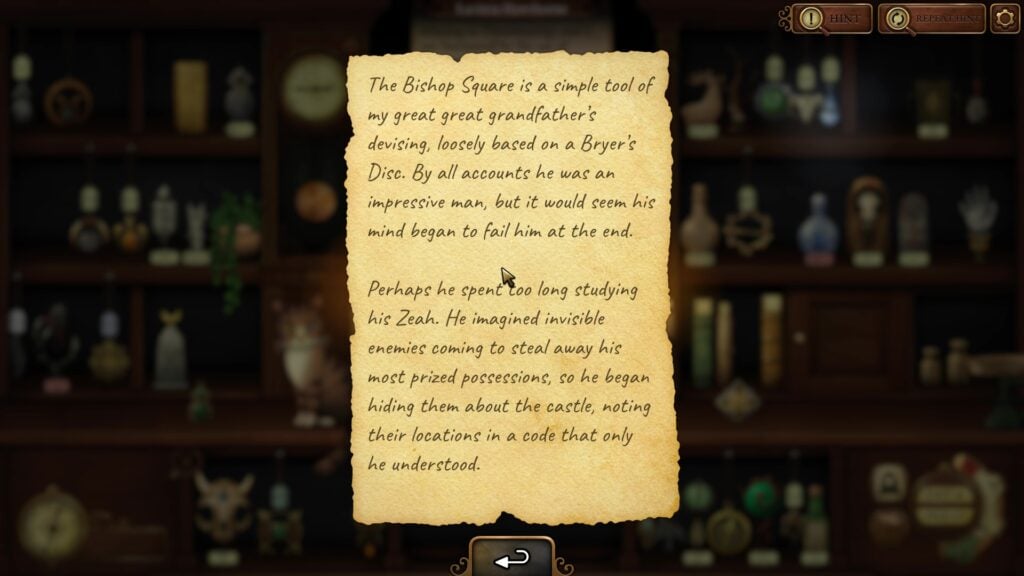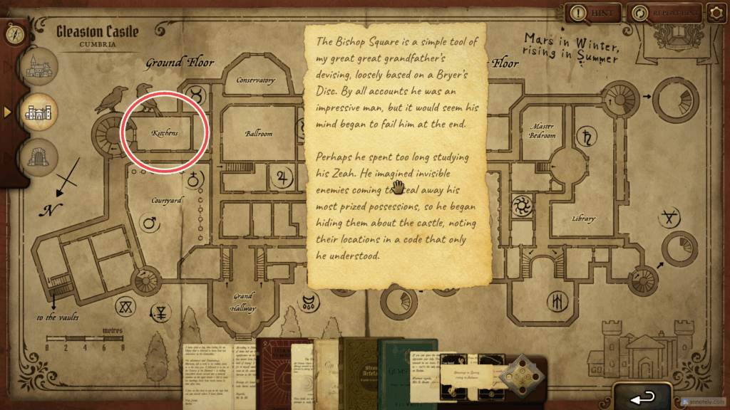 According to the note that you found in the caverns, some of the prized possessions are hidden in the castle, and there’s a code that reveals their location in the castle.